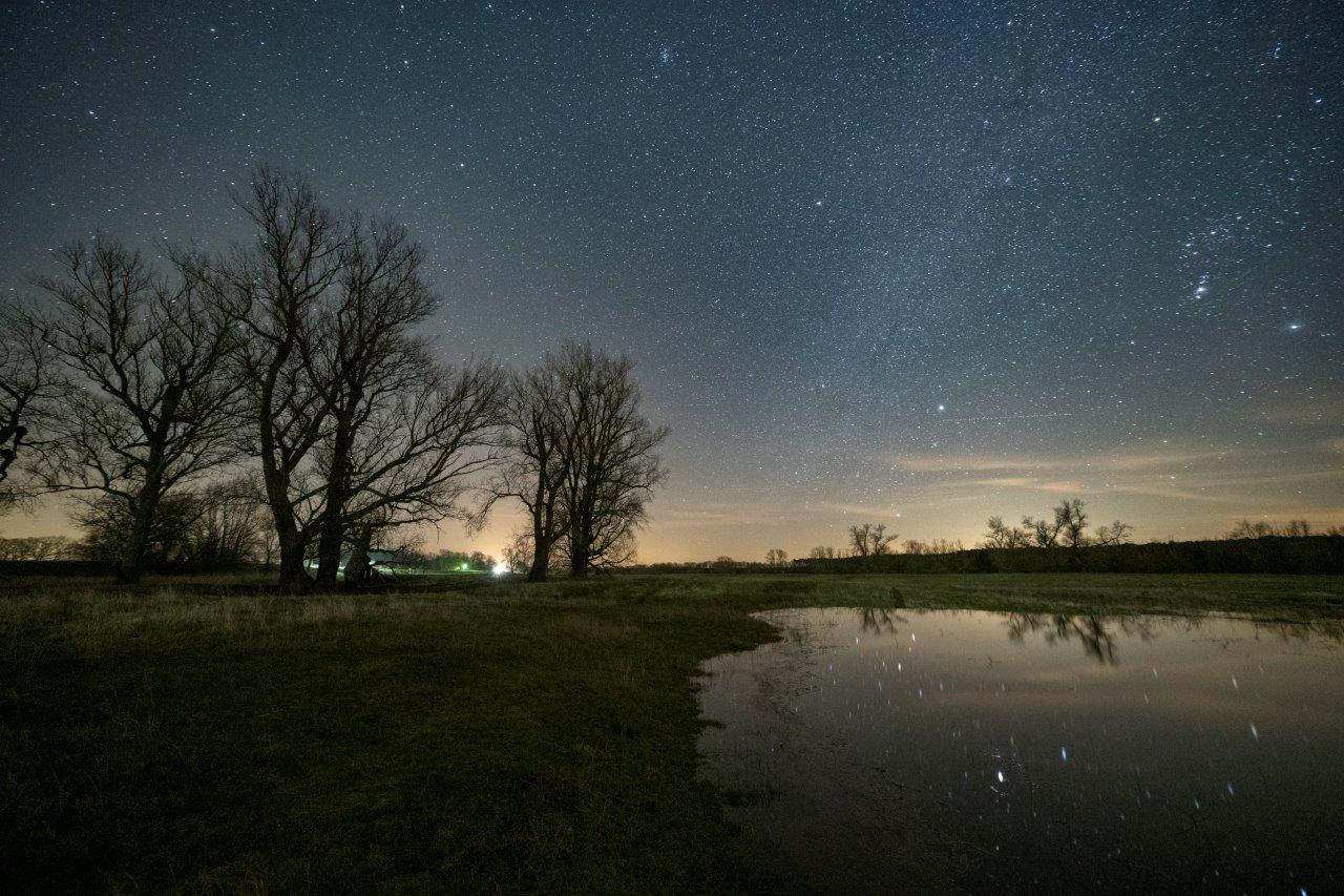 Liebe Sternenfreundinnen, liebe Sternenfreunde, in den zurückliegenden Wochen haben Niederschläge für das Entstehen von Hochwasser an der Elbe gesorgt. Bei meinen Nachtaufnahmen gibt es den gespiegelten Himmel zu sehen, was nach tagelangem Sturm schon eine Art Wunder ist. Bei Bild 6150 konnte ich das Sternbild Orion so platzieren, dass gleichzeitig auch die hellsten Sterne seiner beiden „Hunde“ in der nebenstehenden Schwarzpappel zu sehen sind. Bei dem hellen unteren Stern handelt es sich um Sirius, vom Sternbild Großer Hund. In der Baumkrone befindet sich Prokyon vom Sternbild Kleiner Hund. Damit Ihr einen Eindruck von der dünn besiedelten Lenzer Wische bekommt, habe ich das Bild „Lenzer Wische" hinzugefügt. Das kleine Fachwerkhaus befindet sich aus Sicherheitsgründen auf einer Warft.