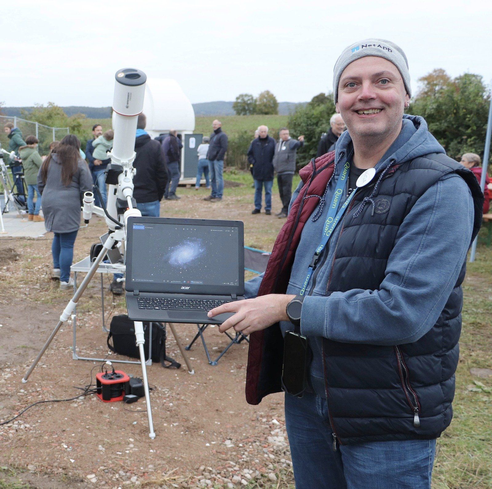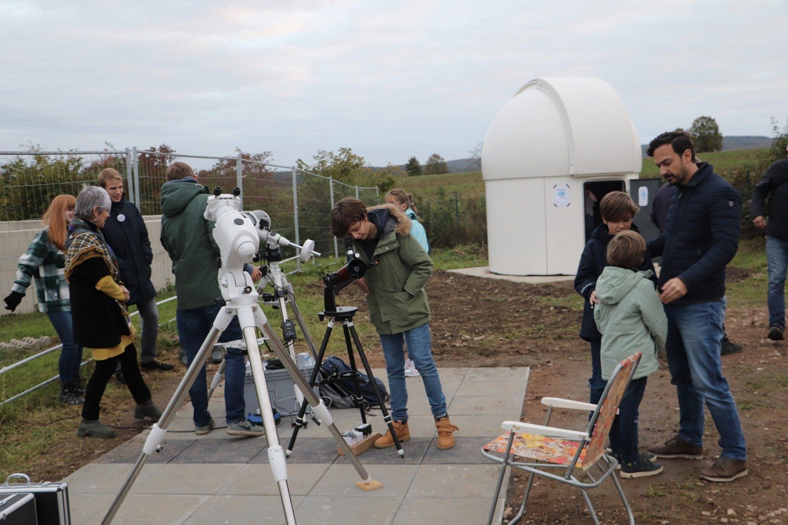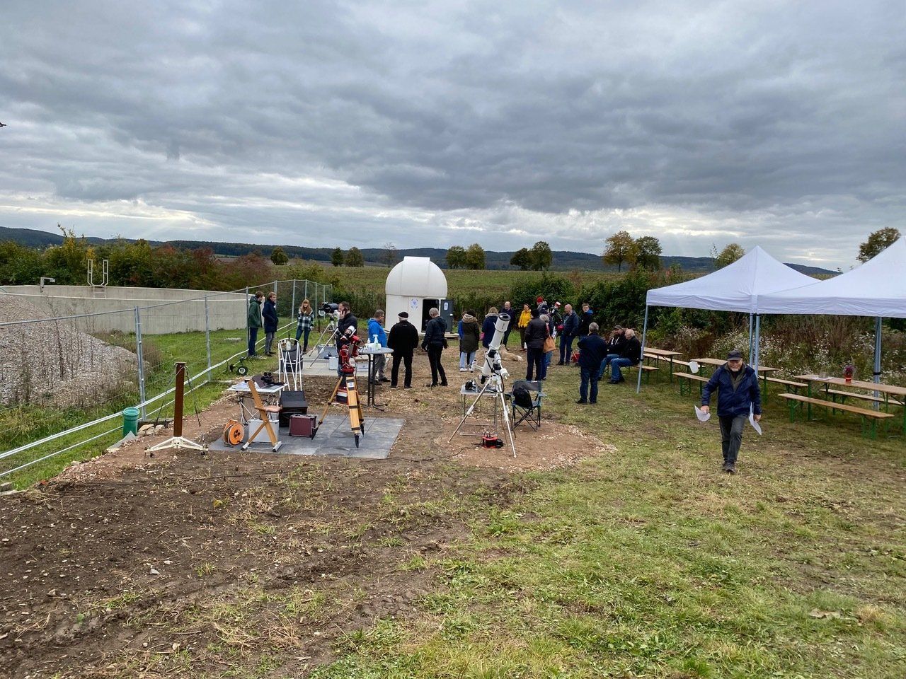 trotz nicht optimalem Wetters hatten sich am Samstag etwa 20 HiGA-Mitglieder und 60 Gäste versammelt, um unsere neue Sternwarte in Lechstedt kennen zu lernen und erste Beobachtungen zu machen. Zwar versteckte sich die Sonne dauerhaft hinter dicken Wolken, aber zumindest am frühen Abend taten sich einige Lücken auf, so dass wir mit unserem Vereinsteleskop und den mitgebrachten Geräten zumindest Mond und Jupiter beobachten konnten.