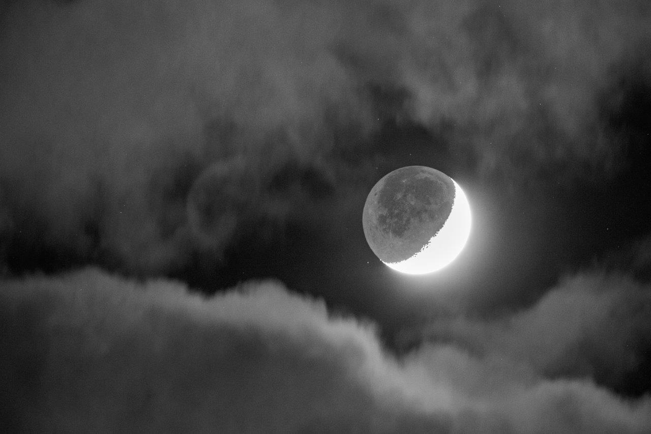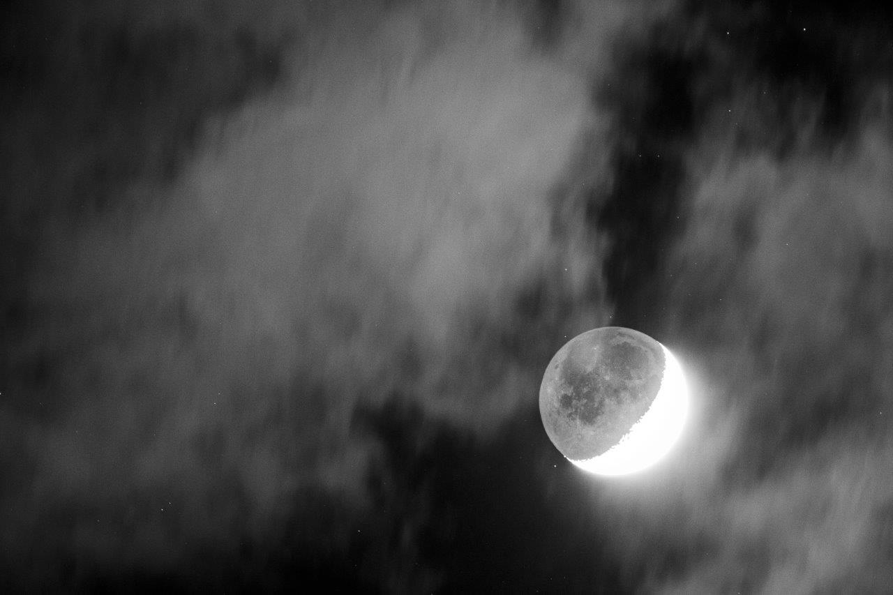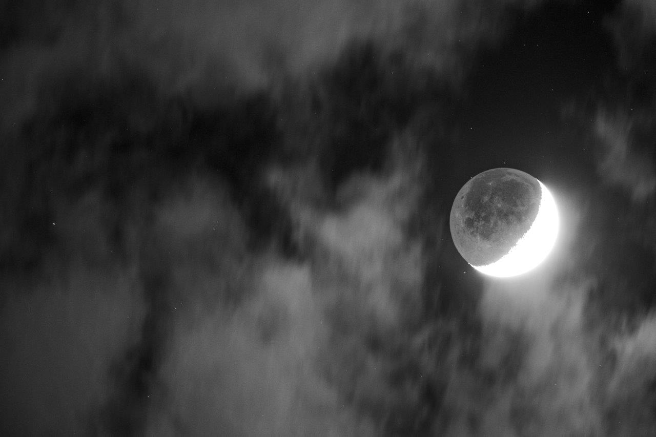 gestern war der zunehmende Mond zu 27,1 % von der Sonne beleuchtet. Auf der Schattenseite des Mondes konnte dabei ein sehr schönes Erdlicht beobachtet werden. Als ich gegen 21:00 Uhr meine Kamera auf den Mond richtete, waren noch keine Wolken am Himmel zu sehen. So konnte ich ungestört Fotos vom Erdlicht aufnehmen. Als ich nach 20 Aufnahmen meine Kamera wieder abbauen wollte, näherte sich aus Richtung Osten eine sehr große Wolkenbank, die schon nach wenigen Sekunden den Nordwesthimmel erreichte. Obwohl ich zuerst an die Demontage meiner Kamera gedacht hab hatte, setzte ich nun meine Aufnahmeserie fort, denn in kleinen Wolkenlücken tauchte manchmal der Mond auf. Dabei konnte ich sogar noch das Erdlicht auf seiner Nachtseite erkennen. Die beigefügten Aufnahmen gehören zu einer Auswahl von 250 Bildern.