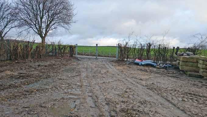 Zwischenzeitlich ist die Heckenbeplanzung an den Grundstücksgrenzen auf Höhe des vorhandenen Zaunes zurückgeschnitten worden, auch wurden bereits die in einer Ecke des Grundstücks befindlichen Bäume gefällt, letzte Baumstümpfe sind noch zu erkennen. Die folgenden Bilder zeigen die aktuelle Situation vor Ort, z. Z. kommt man auf dem Grundstück nur mit Gummistiefeln voran.
