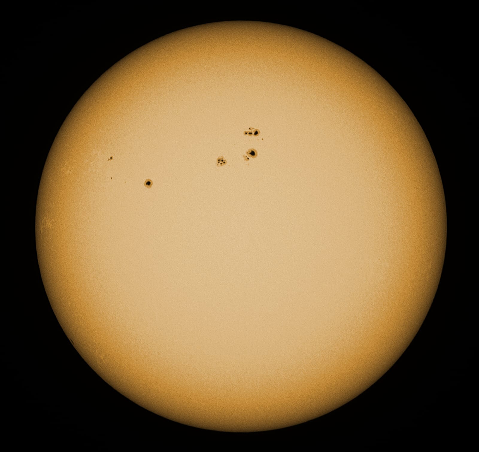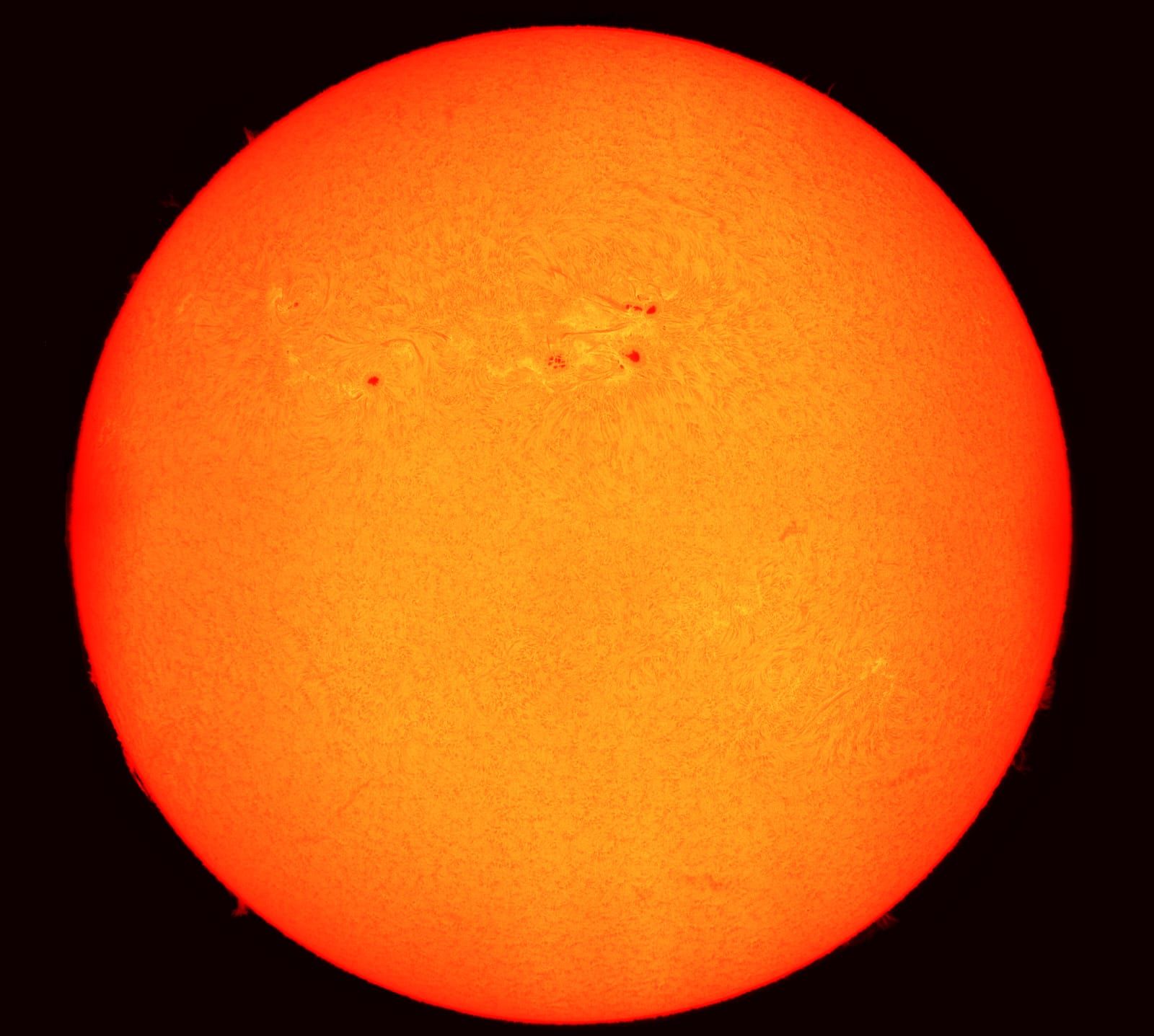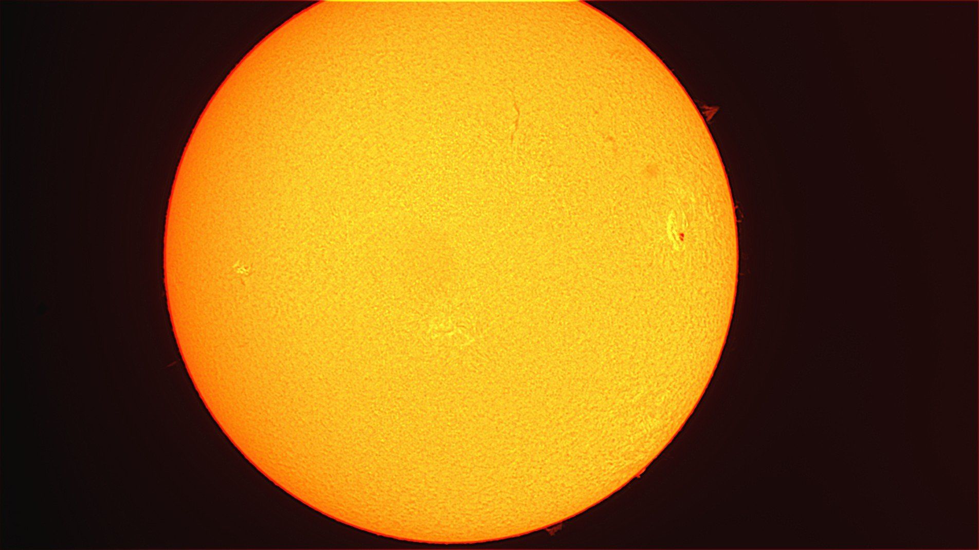 Aufgenommen mit einem 50mm Lunt Sonnenteleskop und einer Farbkamera. Bei diesem Bild habe ich eine andere Belichtungszeit benutzt.