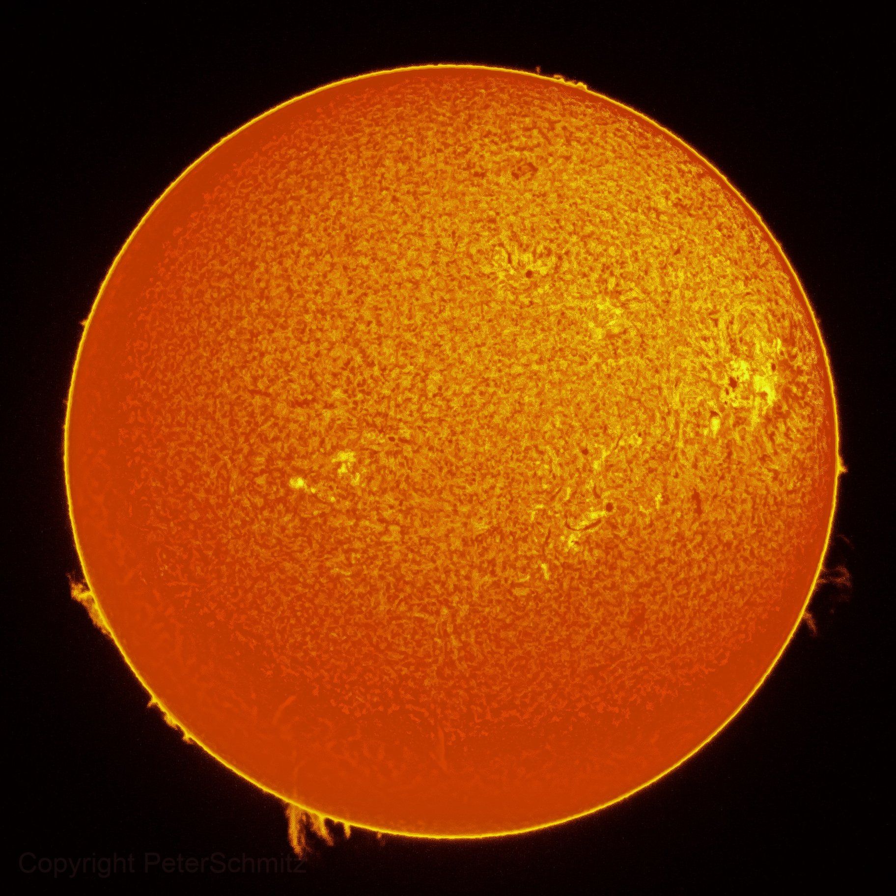 Mit Ha lassen sich Sonnenflecken, Fackeln und Granulen beobachten. Am sichtbaren Sonnenrand sieht man Protuberanzen.