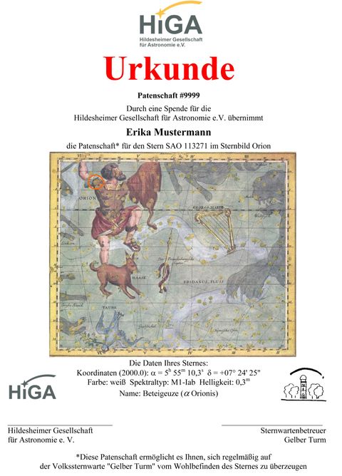 Machen Sie Ihren Lieben ein besonderes Geschenk - Sternpatenschaften können Sie gegen eine Spende von 60€ bei uns erwerben. Teilen Sie uns einfach mit, welchen Namen "Ihr" Stern erhalten soll und ob Sie den Stern aus einem bestimmten Sternbild oder gar einen für Sie besonderen Stern auswählen möchten.